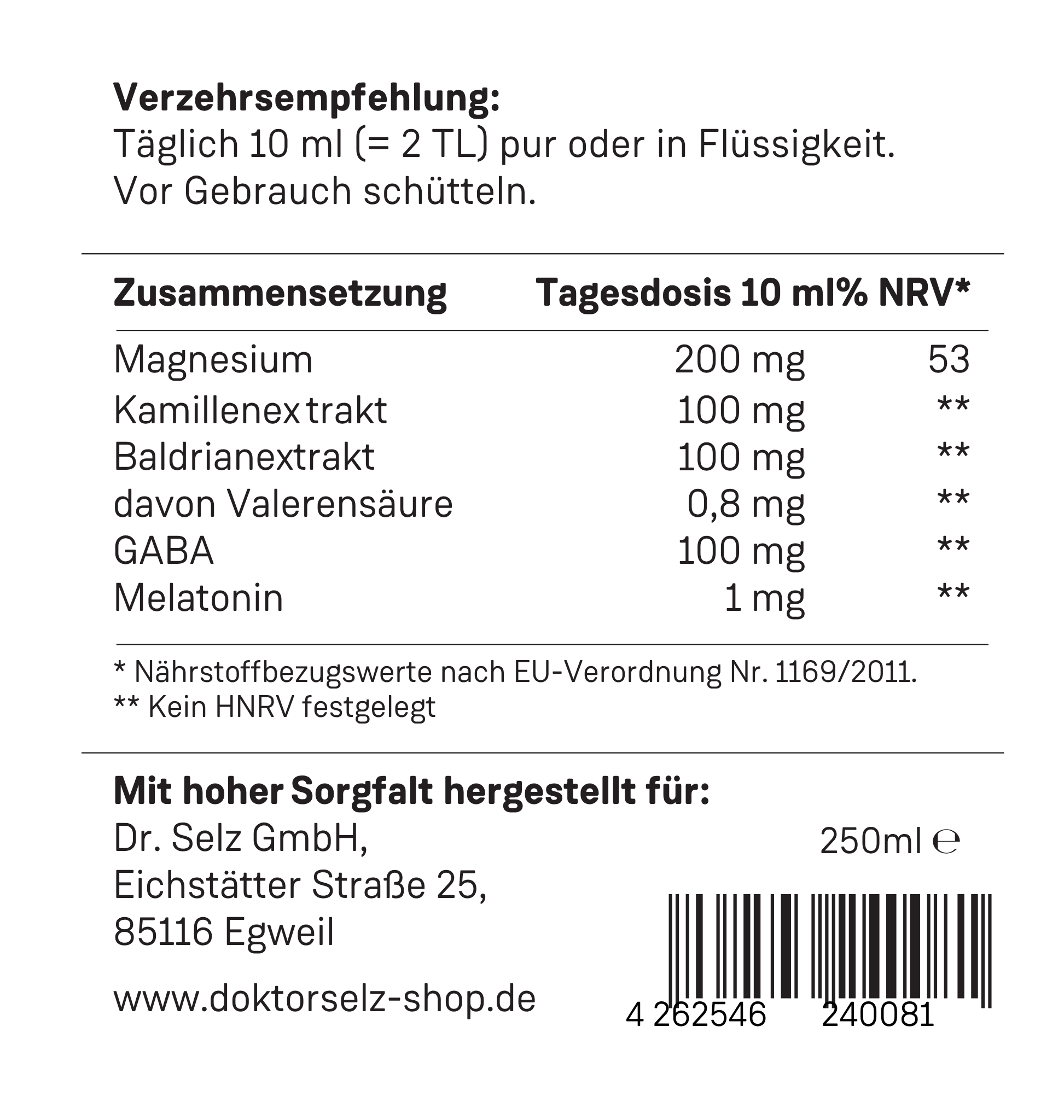 Magnesium 200 mg (53% NRV *), Kamillenextrakt 100 mg (**), Baldrianextrakt 100 mg (**) davon Valerensäure 0,8 mg (**), GABA 100 mg (**), Melatonin 1 mg (**)